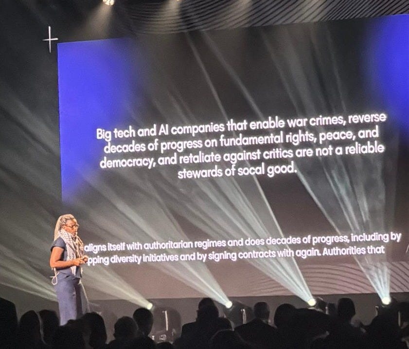 Dr. Abeba Birhane, a cognitive scientist known for her research on algorithmic harm, relational ethics, and the decolonization of computational systems, appeared on the main stage willing to address power (picture below)